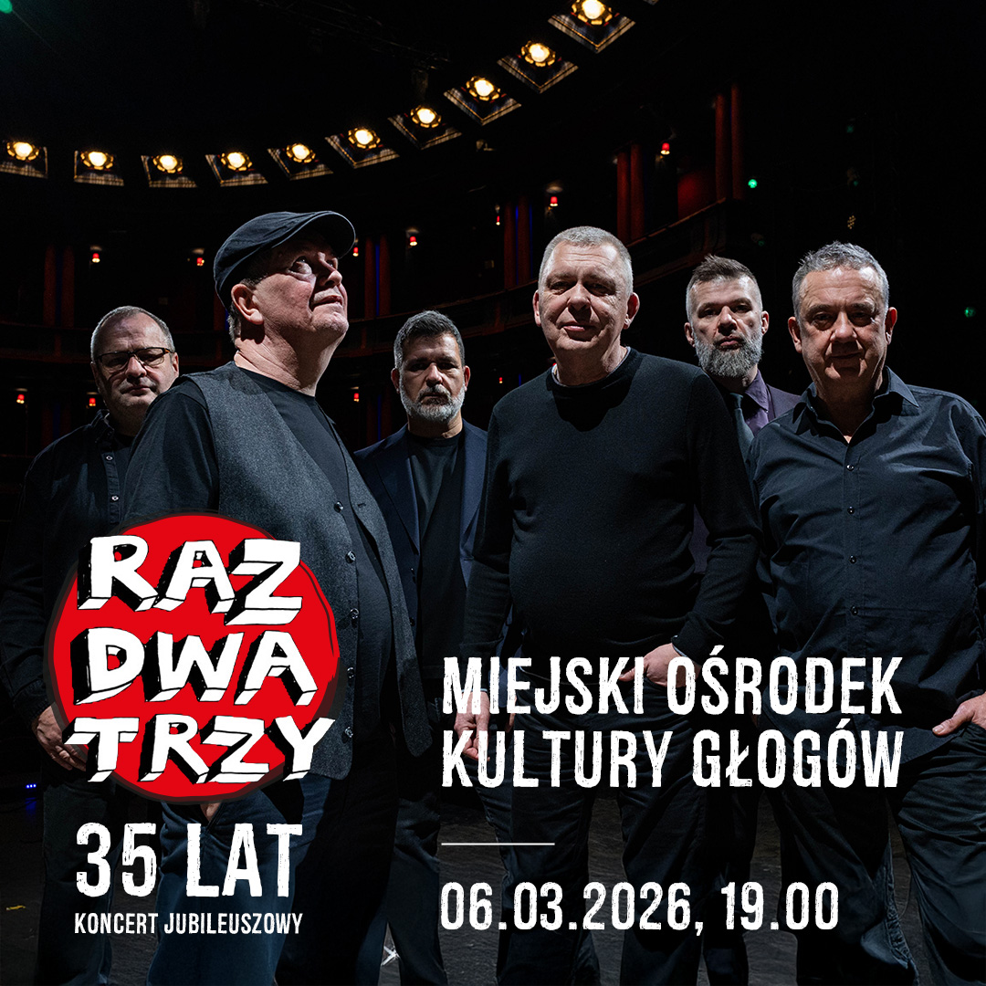 6 marca 2026r. w Centrum Kultury MOK wystąpi zespół Raz, Dwa, Trzy. Jeden z najbardziej rozpoznawalnych i cenionych polskich zespołów na polskiej scenie zagra w Głogowie z okazji jubileuszu 35-lecia. Bilety dostępne w sprzedaży!