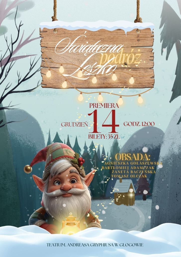 Z wielką radością zapraszamy Państwa na spektakl do Teatru im. Andreasa Gryphiusa w Głogowie. Kolejna świąteczna odsłona naszego spotkania już niebawem! Spektakl "Świąteczna podróż Leszko" to barwna opowieść pełna muzyki, śmiechu i wzruszeń. Opowieść, która przypomina, że czasem wystarczy jedno spojrzenie, jedno słowo, jeden gest... by poczuć, że magia naprawdę istnieje. Razem poczujmy ten świąteczny czas w Teatrze! Świetna zabawa gwarantowana a piosenki towarzyszące w spektaklu nastroją nas na spotkanie z najprawdziwszym Świętym Mikołajem. Święty Mikołaj, Tosia, Zosia i niesforny chochlik Leszko czekają na Was! Nie każda magia ma brodę i czerwony kubrak. Czasem przychodzi niepostrzeżenie - z wiatrem, z melodią, albo z czyimś śmiechem. A czasem trzeba wyruszyć bardzo daleko, żeby odnaleźć ją tuż obok siebie. Gdy cały świat śpiewa świąteczne piosenki, a w powietrzu czuć zapach piernika, pewien chochlik ma nie lada zagadkę do rozwiązania. Zastanawia się, gdzie naprawdę mieszkają Święta? Leszko nie planował tej podróży. Ale kiedy zgasło światło, a dzwoneczki ucichły, coś kazało mu ruszyć za głosem, który brzmiał jak... echo Świąt. W śnieżne pustkowia, wśród lampionów i palm, aż wreszcie tam, gdzie pachnie piernikiem i brzmi kolęda. Ale czy znajdzie to, czego szuka? Dokąd go zaprowadzi? "Świąteczna podróż Leszko"
