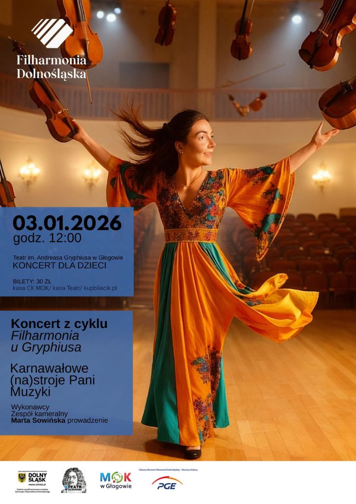 Zapraszamy na koncert Orkiestry Symfonicznej Filharmonii Dolnośląskiej im. Ludomira Różyckiego dla dzieci , który odbędzie się 03.01.2025 r. o godzinie 12.00 w Teatrze im. Andreasa Gryphiusa w Głogowie. Orkiestra Symfoniczna Filharmonii Dolnośląskiej pod kierownictwem Marka Wroniszewskiego zaprasza na, skierowany do najmłodszych widzów, koncert "Karnawałowe (na)stroje Pani Muzyki", odbywający się w ramach cyklu "Filharmonia u Gryphiusa".
