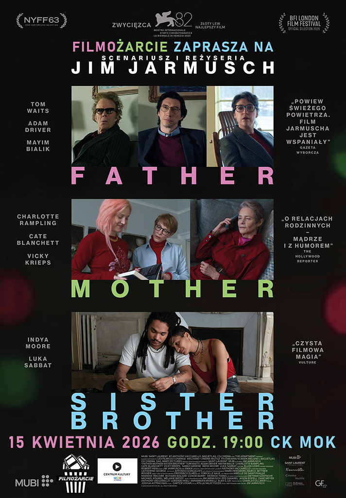 „FATHER MOTHER SISTER BROTHER" to zwycięzca ostatniego festiwalu w Wenecji i najlepszy od lat film Jima Jarmuscha, twórcy „Patersona" i „Broken Flowers". Pełen błyskotliwych obserwacji precyzyjnie skomponowany tryptyk filmowy o relacjach rodzinnych i o tym, co sprawia, że się od siebie oddalamy. Każdy z trzech rozdziałów rozgrywa się współcześnie, w innym kraju: FATHER – w północno-wschodnich Stanach Zjednoczonych, MOTHER – w Dublinie, a SISTER BROTHER – w Paryżu. Film Jarmuscha stanowi zbiór subtelnych, pełnych humoru, ale i nut melancholii portretów ludzkich charakterów. W rolach głównych m.in. Cate Blanchett, Adam Driver, Tom Waits, Vicky Krieps i Charlotte Rampling.